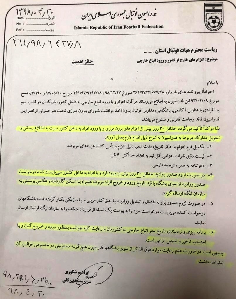دوم؛ پیرو مکاتبه مدیرکل محترم امور مشترک فدراسیون ها در وزارت ورزش و تاکید بر رعایت موارد قانونی خصوصا در مورد درخواست صدور روادید مدعوین خارجی باشگاه استقلال تهران ، سرپرست دبیرکلی فدراسیون فوتبال در تاریخ 20 تیر 1398 با ارسال نامه ای به هیات های فوتبال استان ها (که به پیوست منتشر می گردد) پیرامون اعزام به خارج از کشور و ورود اتباع خارجی تصریح نموده ؛ حداقل 30 روز پیش از اعزام های برون مرزی و یا ورود افراد به داخل کشور نسبت به اطلاع رسانی و تحویل مدارک مربوطه به فدراسیون فوتبال با تاکید بر ضرورت ارسال نامه درخواست صدور روادید از سوی باشگاه همچنین اسکن گذرنامه و عکس نفرات مورد نظر اقدام شود.