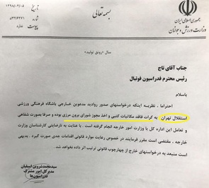 یکم؛ در تاریخ 5 تیرماه 1398 مدیرکل محترم امور مشترک فدراسیون ها در وزارت ورزش و جوانان طی یک فقره نامه (که به پیوست منتشر می گردد) پیرامون صدور روادید مدعوین خارجی باشگاه استقلال تهران خطاب به ریاست محترم فدراسیون فوتبال جناب آقای تاج اعلام می نماید؛ نظر به اینکه درخواست های صدور روادید مدعوین خارجی باشگاه استقلال به کرات فاقد مکاتبات کتبی و اخذ مجوز شورای برون مرزی بوده و صرفا به صورت شفاهی و تعامل این اداره کل با وزارت امور خارجه انجام گرفته مقتضی است مقرر فرمایند در خصوص رعایت موارد قانونی اقدامات جدی صورت پذیرد. بدیهی است منبعد به در خواست های خارج از چهارچوب قانونی ترتیب اثر داده نخواهد شد.